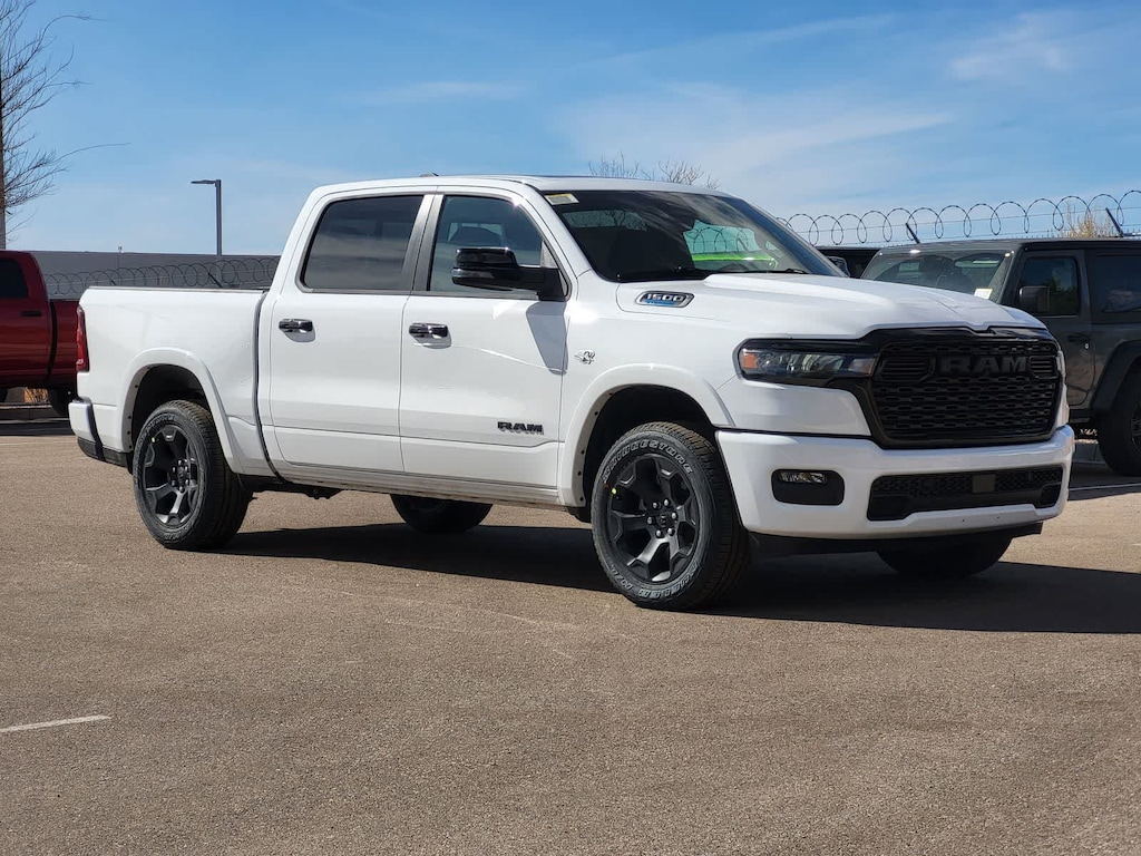 BIG HORN LEVEL 2 EQUIPMENT GROUP SiriusXM Radio Service, Power Adjustable Pedals, Leather Wrapped Steering Wheel, 12 Touchscreen Display, Glove Box Lamp, Auto Power-Folding Mirrors, 115V Auxiliary Rear Power Outlet, Media Hub w/2 Charge Only USBs, Heated Front Seats, Security Alarm, Black Premium Power Mirrors, Premium Overhead Console, 9 Amplified Speakers w/Subwoofer, Disassociated Touchscreen Display, Body Color Fender Flares, Remote Tailgate Release, 115V Auxiliary Power Outlet, LED Dome Lamp w/On/Off Switch, Universal Garage Door Opener, 2nd Row In Floor Storage Bins, Sun Visors w/Illuminated Vanity Mirrors, LED Footwell Lighting, Rear Window Defroster, Rear View Auto Dim Mirror, Rear Power Sliding Window, GPS Navigation, Overhead LED Lamps, Wheels: 20 x 9 Aluminum Chrome Clad, ENGINE: 5.7L V8 HEMI MDS VVT ETORQUE Active Noise Control System, Heavy Duty Engine Cooling, Passive Tuned Mass Damper, GVWR: 7,100 lbs, Dual Rear Exhaust w/Bright Tips, G/T Exhaust, 18 Aluminum Spare Wheel, DUAL-PANE PANORAMIC SUNROOF Dome Dual LED Reading Lamp, NIGHT EDITION Tires: 275/55R20 OWL All Season, Bridgestone Brand Tires, Accent Color Premium Power Mirrors, Exterior Mirrors w/Supplemental Signals, Black Headlamp Bezels, Exterior Mirrors Courtesy Lamps, Grille Black Surround Black Mesh, Auto Power-Folding Mirrors, Wheels: 20 x 9.0 Aluminum Painted Clad, Auto Dim Exterior Driver Mirror, Black Exterior Truck Badging, Anti-Spin Differential Rear Axle, Accent Color Door Handles, Accent Color Tailgate Handle, Black Interior Accents, Dual Exhaust w/Black Tips, Body Color Front Bumper, Body Color Rear Bumper w/Step Pads, Black Tail Lamp Bezels, RAM Grille Badge - Black, Black Painted Exterior Mirrors Caps, BED UTILITY GROUP MOPAR Spray In Bedliner, MOPAR 4 Adjustable Cargo Tie-Down Hooks, Pick-Up Box Lighting, Exterior 115V AC Outlet, MOPAR FRONT & REAR RUBBER FLOOR MATS, TRANSMISSION: 8-SPEED AUTOMATIC (8HP75). Ram Big Horn with Bright White Clearcoat exterior and Black interior features a 8 Cylinder Engine with 395 HP at 5600 RPM*.